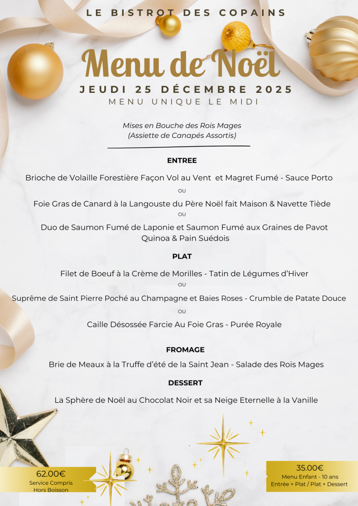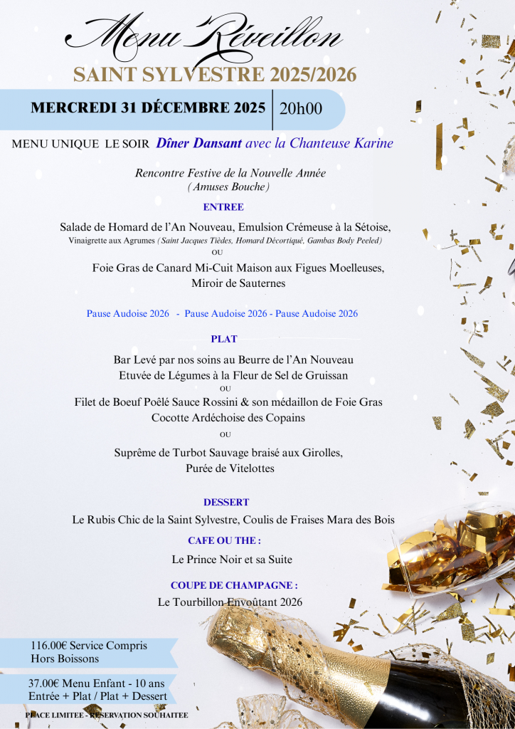 Nous vous laissons aussi le soin de prendre connaissance de nos Menus pour le 25 et le 31 décembre (réservation conseillée).