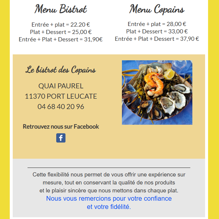 Restaurant crée il y à plus de 20 ans, spécialisé dans la cuisine méditerranéenne, nous vous proposons une carte variée : crustacés, poissons, viandes…